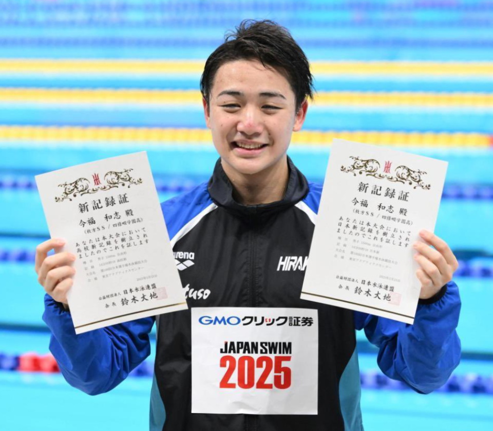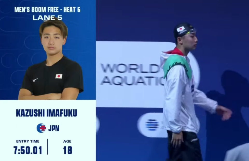 在今年的全锦赛暨世锦赛选拔赛上,今福和志曾以7分50秒01打破日本高中纪录,现在又晋级为打破全国纪录。而男子1500自的日本全国纪录,是今福和志在全锦赛上创造的14分50秒18。